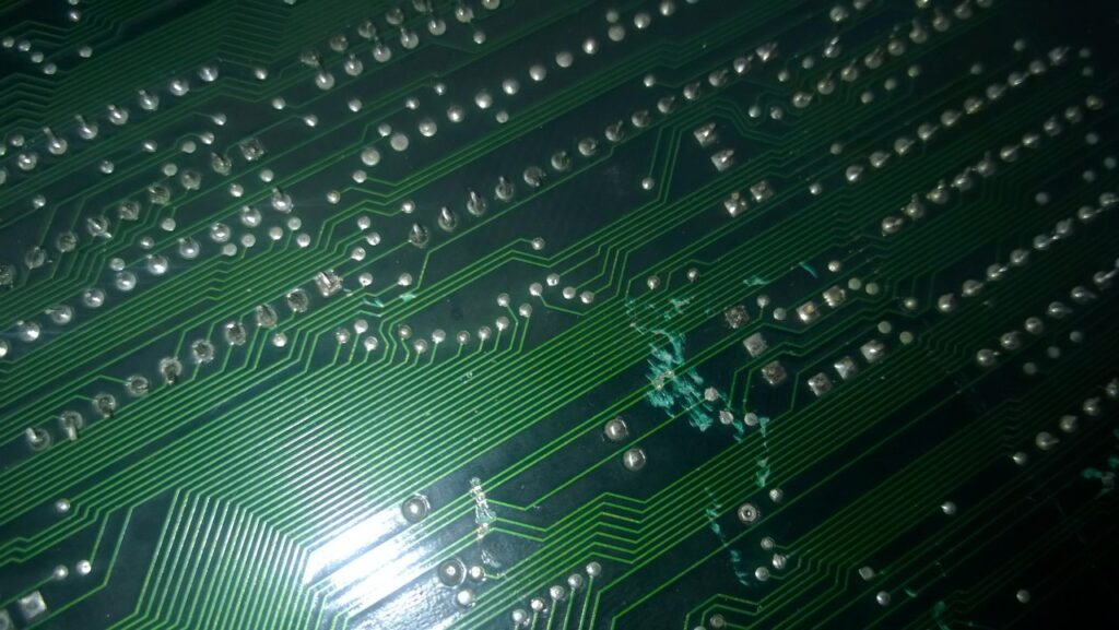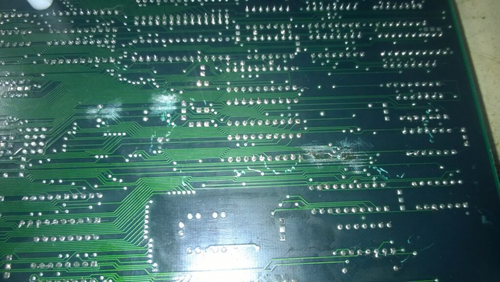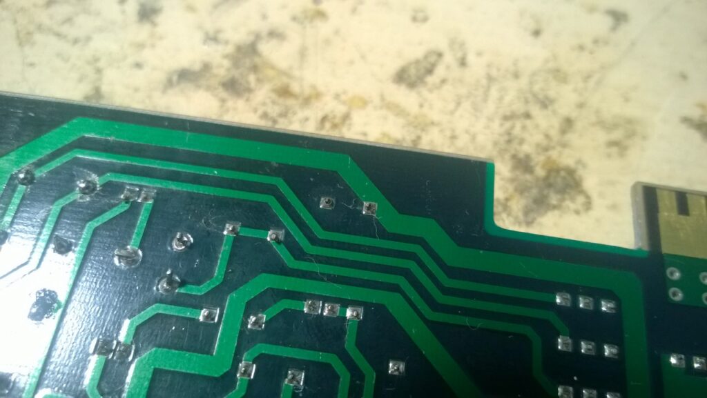 On notera quelques pistes coupées et des pattes traversantes en contact (réseaux de résistances…).