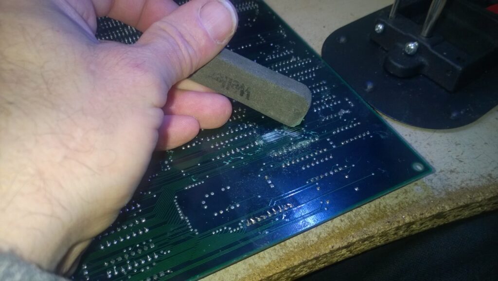 J’ai donc abrasé le vernis des zones marquées pour pouvoir étamer au cuivre et recréer les pistes sectionnées.